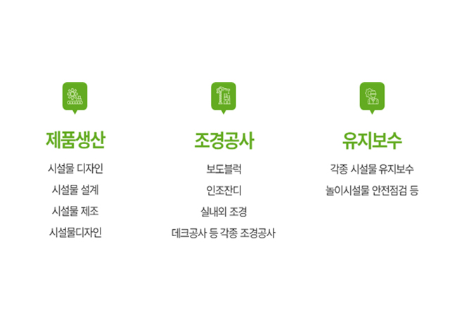| 직무내용 | 조경시설물 설계 및 디자인 | 주요협력사 | 관공서 및 지방자치단체, 학교등 놀이터 및 공원, 아파트입주자대표회의 | |